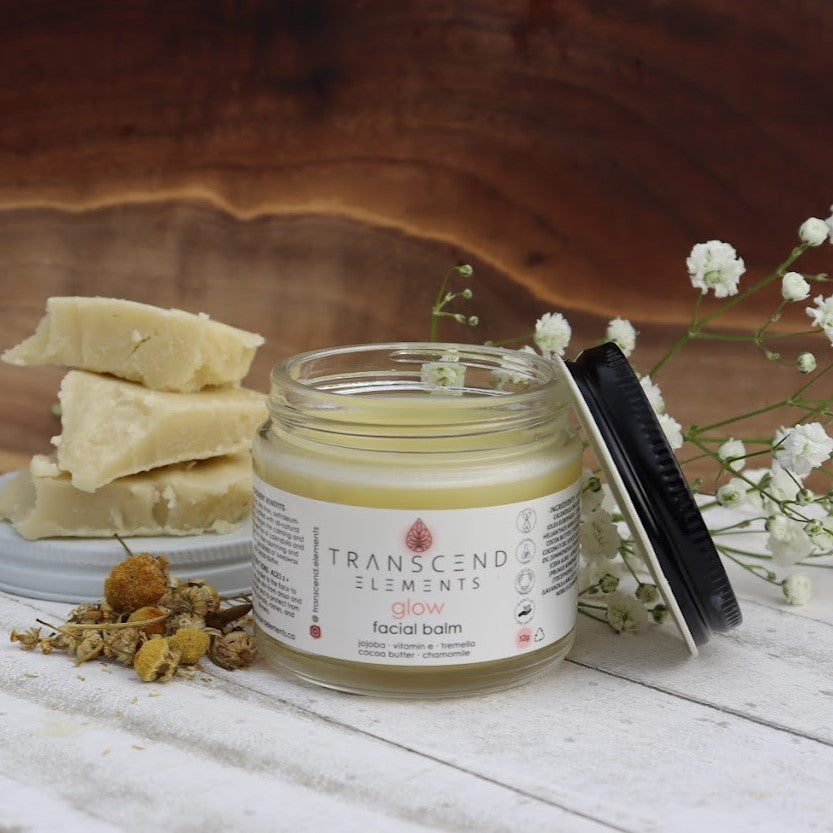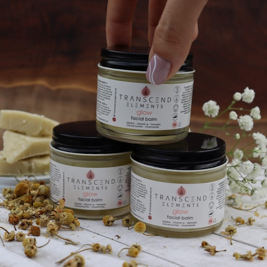 Glow is an organic, zinc-free, petroleum-free balm created with a blend of nourishing butters and soothing and protective ingredients. This balm calms skin, aids in prevention of breakouts, and encourages a healthy glow.